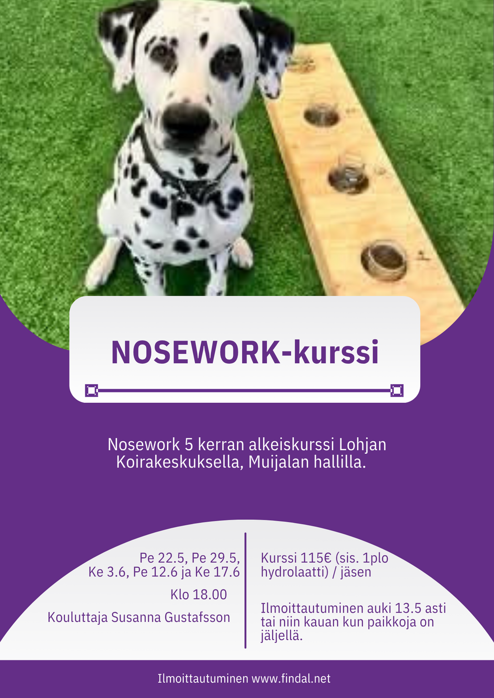 Dalmatiankoirat-Dalmatinerna ry järjestää Noseworkin viiden kerran alkeiskurssille Lohjan koirakeskuksella, Muijalan hallilla Sampokuja 3, Lohja.